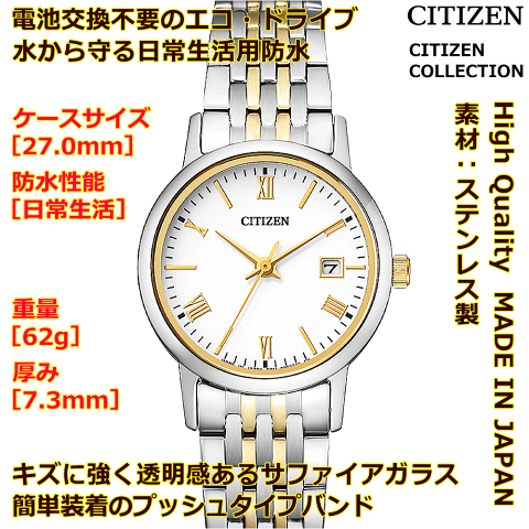 ◆ギフト対応アイコン詳細 ■主な共通特徴CITIZEN CITIZENコレクション エコ・ドライブ 【男性用】 商品詳細ムーブメントエコ・ドライブ(光発電6ヶ月) 精度:±15秒/月サイズ重量:104g 厚み:8,0mmケースケースサイズ【⇔】:36,5mm ステンレス 日常生活用防水ガラスサファイアガラスバンド三ツ折れプッシュタイプ中留機能秒針停止機能 日付早修正機能 充電警告機能 過充電防止機能CITIZEN CITIZENコレクション エコ・ドライブ 【女性用】 商品詳細ムーブメントエコ・ドライブ(光発電6ヶ月) 精度:±15秒/月サイズ重量:63g 厚み:7,6mmケースケースサイズ【⇔】:27,0mm ステンレス 日常生活用防水ガラスサファイアガラスバンド三ツ折れプッシュタイプ中留機能秒針停止機能 日付早修正機能 充電警告機能 過充電防止機能■三ツ折れプッシュタイプバンドの参考画像■腕時計のサイズ調整も無料でお受けいたします♪