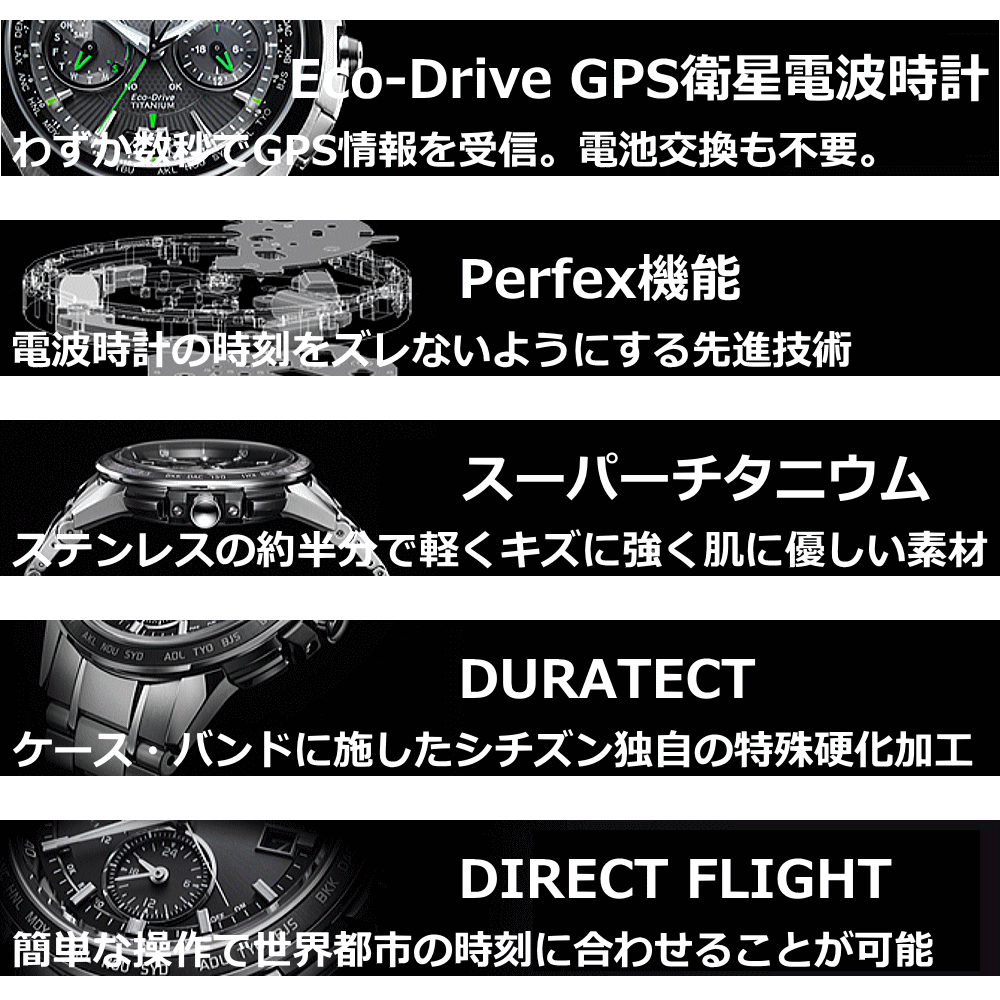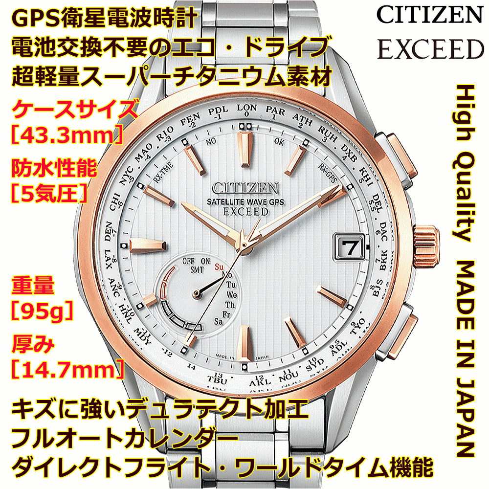 ◆ギフト対応アイコン詳細 ■主な特徴CITIZEN EXCEED/エクシード エコ・ドライブ GPS衛星電波時計 商品詳細ムーブメントエコ・ドライブ GPS衛星電波受信(光発電7年) 精度:±5秒/月(非受信時)サイズ重量:95g 厚み:14,7mmケースケースサイズ【⇔】:43,3mm ケース:スーパーチタニウム 表面処理:デュラテクトプラチナ・デュラテクトピンク(ライトシルバー色・ピンクゴールド色) 5気圧防水ガラスデュアル球面サファイアガラス(99%クラリティ・コーティング)バンド三ツ折れプッシュタイプ中留特徴ダブルダイレクトフライト針表示式(ワールドタイム機能) パーフェックス搭載機能デイ&デイト表示 衛星電波受信 位置情報取得機能 ワールドタイム機能(27都市を含む40時差) サマータイム機能 衝撃検知機能 針自動補正機能 ライトレベル インディケーター 充電量表示機能 充電警告機能 過充電防止機能 過放電検出機能 充電禁止温度検出機能■三ツ折れプッシュタイプバンドの参考画像■腕時計のサイズ調整も無料でお受けいたします♪